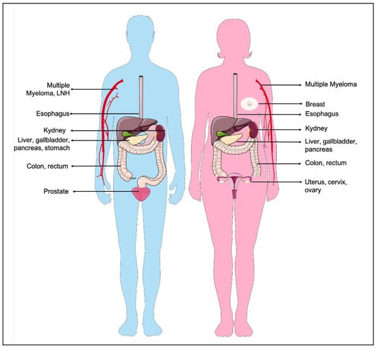 Overweight and obesity increased the risk for developing cancer in different sites. Body fat has been associated with increased risks for a number of cancers that occur in different sites according to sex. The cancer types depicted in the figure displayed increased mortality rate if in association with an obesity condition. Parts of the figure were drawn by using pictures from Servier Medical Art. Servier Medical Art by Servier is licensed under a Creative Commons Attribution 3.0 Unported License.