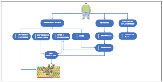 The complexity of epidemiological evidence about the relationship between obesity and cancer reflects the wide interplay among metabolic pathways involved in cancer development, progression, and pharmacological responsiveness. To date, a plethora of circulating factors and molecular alterations, whereby obesity can lead to carcinogenesis, have been detected. Despite this, primarily relevant mechanisms are not well understood. Here, we provide an overview of the principal identified factors that link altered metabolism to tumor onset and progression, focusing on three typical and deeply interplaying cornerstones of obesity which are also possible early diagnostic biomarkers and strong predictors of cancer risk: adiposity, chronic low-grade inflammation, and hyperinsulinemia (Figure 2).