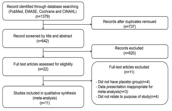 The search identified 1379 articles, and after the removal of duplicates, 737 were screened by title and abstract. Most (n = 620) were excluded because they were not relevant: Duplicates (n = 22), nonrandomized controlled trial (n = 53), and review or non-human study (n = 545). After assessing the full text of 22 potentially related articles, eleven articles were included. The most important reasons for exclusion were non-compliance with SR-MA criteria: No placebo group (4); subjects unrelated to the aim of the review (athletes, other functionality, age) (4); or sex bias, a short communication study, or lacked anthocyanin information (3). Figure 1 shows the study identification and selection process.