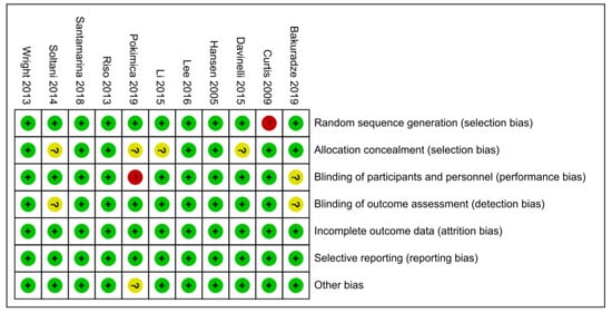 To assess the risk of bias in RCTs, the RoB tool developed by the Cochrane group was used. For random sequence generation, 10 among the 11 RCTs used computerized generation, where the RoB was found to be low [11,12,14,15,16,19,21,22,23,27], and 1 RCT did not report on the method of generation [20]. The RoB of allocation concealment was “low” in seven RCTs [14,15,16,20,21,22,23] and “unclear” in four. For the double-blinding of the participants and personnel, the RoB was “low” in nine RCTs [11,12,14,15,19,20,21,22,27], “high” in one, and “unclear” in one due to the lack of clear description [23]. For the blinding of the outcome assessments, the RoB was “low” in nine RCTs and “unclear” in two [16,27]. The RoB of the incomplete outcome data and selective reporting was “low” in 11 RCTs (Figure 2).