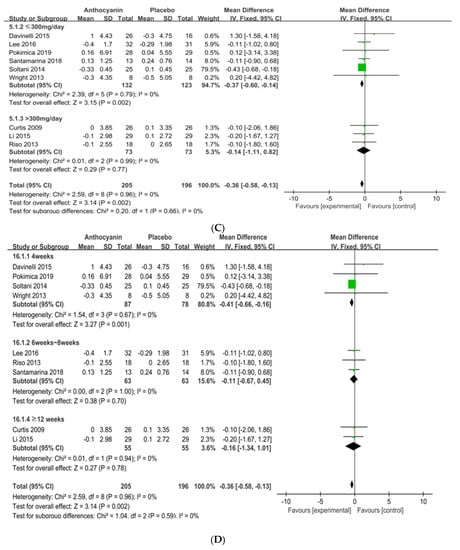 The analysis of the effect of anthocyanin supplementation on BMI in nine RCTs (n = 401) showed a reduction of 0.36 kg/m2 in the anthocyanin supplementation group, compared with the placebo group (95% CI = −0.58–0.13; I2 = 0%; p = 0.002) (Figure 3A). The funnel plot showed that the nine RCTs were in symmetry, indicating low publication bias. When the BMI was analyzed after categorizing the subjects into non-obese (non-OB) healthy individuals (five RCTs; BMI < 25) and obese (OB) individuals (four RCTs; BMI ≥ 25), the BMI after anthocyanin supplementation fell by 0.40 kg/m2 (95% CI = −0.64–0.16; I2 = 0%; p = 0.001) (Figure 3B). When the subjects were categorized into three groups according to anthocyanin dosage, supplementation BMI in Group 1 showed a significant reduction of 0.37 kg/m2 (six RCTs; ≤300 mg/day), compared to that of Group 2 (three RCTs; 95% CI = −0.60–−0.14; I2 = 0%; p = 0.002, Figure 3C). When the subjects were categorized into three groups according to dose duration, anthocyanin supplementation in the Group 1 BMI produced a significant reduction (four RCTs; −0.41 kg/m2; 4 weeks), compared to that of Group 2 (three RCTs: 6–8 weeks) and Group 3 (two RCTs; ≥12 weeks; 95% CI = −0.66–−0.16; I2 = 0%; p = 0.001, Figure 3D). However, when the intervention periods were classified by group, Group 1 (seven RCTs: 4–8 weeks) and Group 2 (two RCTs; ≥12 weeks), significant BMI reduction was found in Group 1 (−0.36 kg/m2; 4–8 weeks; 95% CI = −0.59–0.14; I2 = 0%; p = 0.002).