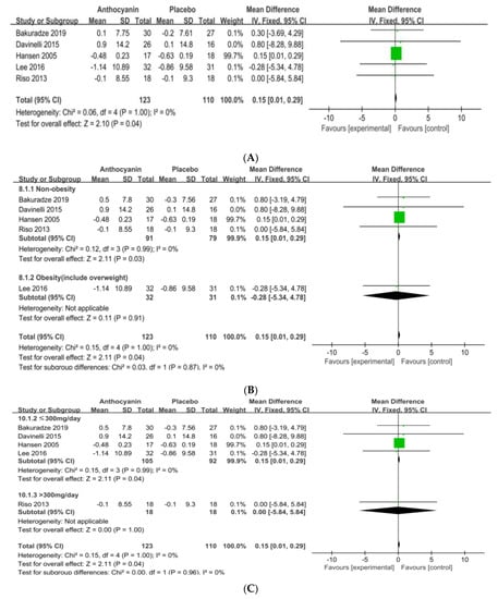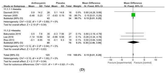 The analysis of the effect of anthocyanin supplementation on BW in five RCTs (n = 233) showed that it increased by 0.15 kg, compared with that of the control group (95% CI = 0.01–0.29; I2 = 0%; p = 0.04) (Figure 4A). The funnel plot showed that the five RCTs were in symmetry, indicating a low publication bias. After categorizing the subjects into healthy (four RCTs, non-OB; BMI < 25) and obese (one RCT, OB; BMI ≥ 25) individuals, the BW was higher by 0.15 kg in the former after anthocyanin supplementation (95% CI = 0.01–0.29; I2 = 0%; p = 0.03) (Figure 4B). When the subjects were categorized into two groups according to dosage, the BMI was higher by 0.15 kg in Group 1 (four RCTs; ≤300 mg/day) than in Group 2 (one RCT; >300 mg/day; 95% CI = 0.01–0.29; I2 = 0%; p = 0.04) (Figure 4C). When the subjects were categorized into two groups according to intervention duration, the BW in Group 1 (two RCTs; ≤4 weeks) was significantly higher than that in Group 2 (three RCTs; >4 weeks), and after anthocyanin supplementation, the BW was higher by 0.15 kg in the former (95% CI = 0.01–0.29; I2 = 0%; p = 0.04, Figure 4D).