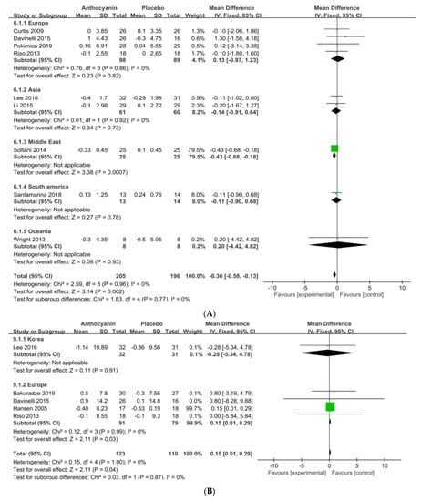 The subjects were categorized into five groups according to geography: Group 1 (four RCTs, Europe), Group 2 (two RCTs, Asia (China, South Korea)), Group 3 (one RCT, Middle East (Iran)), Group 4 (one RCT, South America (Brazil)), and Group 5 (one RCT; Oceania (Australia)). The analysis of the effect on BMI showed a significant fall in Group 3 (Figure 5A). When the subjects were categorized into two group, Group 1 (one RCT; Asian, South Korea) and Group 2 (four RCTs; Caucasian, Europe), anthocyanin supplementation significantly increased the BW by 0.15 kg in Group 2 (95% CI = 0.01–0.29; I2 = 0%; p = 0.03) (Figure 5B). In summary, this SR-MA showed that while there was a significant reduction in BMI, there was no reduction in BW or WC, and ethnic difference influenced each indicator of obesity (Table 2).