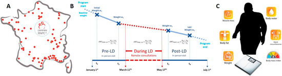 Study design and outcomes assessed in participants in a multicenter nationwide weight loss program. (A) Geographical distribution of the RNPC® centers in France (B) Study design: data were prospectively collected at two time-points before and after the nationwide total lockdown (LD) due to Covid19 in France, during in-person appointments with a RNPC® dietician. Remote consultations with the RNPC® dietician were conducted by phone during the LD period. Median period durations between two measures: before lockdown (t2-t1): 15 days [15; 17], during LD (t3-t2): 99 days [92; 106], after LD (t4-t3): 15 days [15; 21]—dWL: delta weight loss (dWL) for details regarding calculation of dWL, see “Outcomes and definitions”. (C) Data collection: at a face-to-face consultation with a dietician, measurements made using an impedance scale (the same Beurer BG42 calibrated bioelectrical device) for weight, muscle mass, fat mass and body water. Waist circumference was measured to the nearest cm at the natural waist. Body mass index was calculated by dividing the weight in kilos by the height squared.