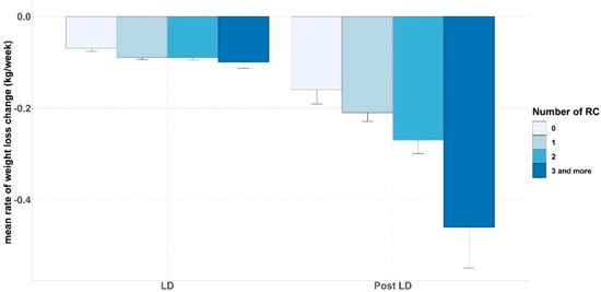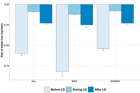 Finally, there is a significant difference in the rate of weight loss in kg/week before LD (0.5 kg/week [0.1; 1]) compared to during LD (0.1 kg/week [0; 0.1]), p < 0.01.