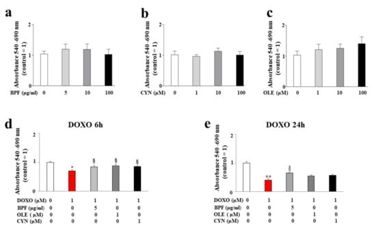 Measurement of cell viability. Cell viability following treatment with different concentrations of BPF (panel a), OLE (panel b), and CYN (panel c) was determined. The doses of the natural compounds were chosen arbitrarily and did not result in a reduction in cell viability compared with control cells. Cell viability after 24 h of pre-treatment with the lowest concentrations of BPF (5 μg/mL), OLE (1 μM), or CYN (1 μM), and subsequent treatment with 1 μM of DOXO for 6 (d) or 24 h (e) was assessed. The values of three independent experiments are expressed as the means ± standard deviations. * denotes p < 0.05 vs. control; ** denotes p < 0.01 vs. control; § denotes p < 0.05 vs. DOXO. Analysis of Variance (ANOVA) was followed by the Tukey–Kramer comparison test.
