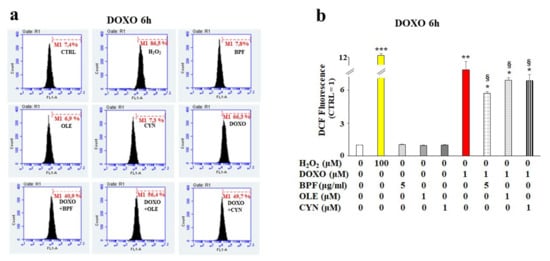 Based on our first data observations, we chose to continue the analysis of the early toxic effects of DOXO by deepening our study of the 6 h treatment of H9c2 cells with DOXO to understand whether the natural compounds considered could provide cellular protection in the early stages of anthracycline damage. Since DOXO causes oxidative damage in cells, the rise of ROS production was quantified in our experimental model. As shown in Figure 2, treatment with DOXO resulted in an increase in ROS production (p < 0.01 vs. control). Interestingly, after pretreatment of the cells with BPF, OLE, or CYN for 24 h, statistically significant protection against DOXO-induced ROS accumulation was registered (p < 0.05; Figure 2, panel b). Hydrogen peroxide (H2O2) was used as a positive control. Ten thousand cells per sample were acquired using a FACS Accury laser flow cytometer (Becton Dickinson). No ROS accumulation was observed in cells treated with natural compounds alone (Figure 2, panel b).
