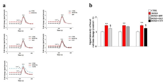Measurement of basal calcium ion levels. Modulation of the basal concentration of calcium ions released from the endoplasmic reticulum after treatment with 1 μM of DOXO alone or after co-treatment with DOXO and BPF (5 μg/mL), OLE (1 μM), or CYN (1 μM) was measured (panel a). Treatment with TAPSI was used as a positive control. Relative quantification of the signal intensity of the basal calcium change was conducted (panel b). Representative graphs of three independent experiments are shown. ** denotes p < 0.01 vs. control; § denotes p < 0.05 vs. DOXO. The Analysis of Variance (ANOVA) was followed by the Tukey–Kramer comparison test.