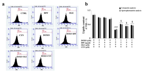 Lipid content measurement. The lipid content was analyzed spectrophotometrically after treatment with 1 μM DOXO for 6 h; BPF (5 μg/mL), OLE (1 μM), or CYN (1 μM) for 24 h; or co-treatments. Values of three independent experiments are expressed as the means ± standard deviations. ** denotes p < 0.01 vs. control; § denotes p < 0.05 vs. DOXO. The Analysis of Variance (ANOVA) was followed by the Tukey–Kramer comparison test.