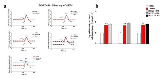 Finally, the basal cytoplasmic calcium ion level was measured after ATF6 silencing. As shown in Figure 8, ATF6 silencing led to a significant modulation of basal calcium ion levels. In particular, the treatment of cells with DOXO caused a greater release of calcium ions compared to that obtained under the same experimental conditions in non-silenced cells (p < 0.01). Intriguingly, under these experimental conditions, pre-treatment with BPF, OLE, or CYN failed to prevent the detrimental effects induced by DOXO (Figure 8, panels a and b). To better appreciate the differences in calcium modulation in cells silenced for ATF6 compared with non-silenced cells, Figure 8 and Figure 5 can be compared.
