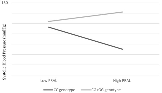 There were no significant interaction effects between PRAL and IGF1 (rs35767 and rs7136446) SNPs on SBP, DBP, FBG, TG, or HDL and cholesterol ratio (Table 3). Instead, the interaction between PRAL and IL6 gene polymorphism was associated significantly with SBP (β = 0.19, p = 0.041). As shown in Figure 1, lower SBP was observed as corresponding to lower PRAL among the respondents with CC genotypes. On the other hand, among the G allele carriers (CG + GG), we observed that the higher the PRAL, the lower the SBP.