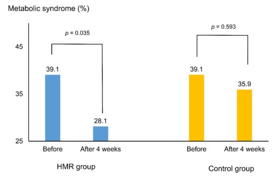 Figure 2 and Figure 3 depict the percentage of subjects with MetS and its components, before and after the trial. The initial percentage of subjects with MetS was 39.1% in both groups. After 4 weeks, the percentage significantly reduced to 28.1% only in the HMR group (p = 0.035). Despite a decrease in the control group, the change was statistically insignificant (p = 0.593). Among the MetS components, the proportion of meeting criteria for hypertriglyceridemia (TG ≥ 150 mg/dL) significantly decreased from 34.4% to 20.3% in the HMR group (p = 0.020) (Figure 3).