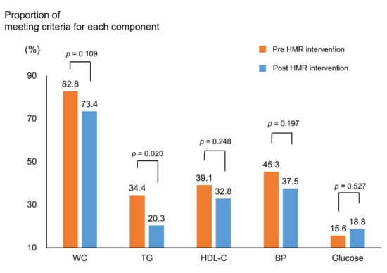Proportion meeting criteria for each component of metabolic syndrome in intervention group. p-values were calculated using the McNemar test; criteria for each component: Central obesity (WC ≥ 90 cm in men and ≥ 85 cm in women), hyperglycemia (IFG ≥ 100 mg/dL), hypo-HDL-cholesterolemia (HDL-C < 40 mg/dL in men and < 50 mg/dL in women), hypertriglyceridemia (TG ≥ 150 mg/dL), and high BP (SBP ≥ 130 mmHG or DBP ≥ 85 mmHg); Abbreviations: HMR, home meal replacement; WC, waist circumference; TG, triglycerides; HDL-C, high-density lipoprotein cholesterol; BP, blood pressure.