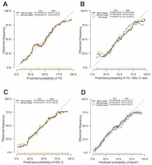 In fully adjusted linear regression models (Model 2), DBI-TS scores were positively associated with fasting serum HDL-C, and DBI-LBS scores were inversely associated with fasting serum concentrations of HDL-C (both p < 0.001) (Table 5). Similarly, further logistic regression analysis with ROC demonstrated that DBI-TS scores were positively associated with fasting serum concentrations of HDL-C (OR = 1.044, 95% CI: 1.010 to 1.079, Pseudo R2 = 0.283, p = 0.011, Supplementary Table S9) and the AUC of this model was 76.5% (95% CI: 70.9% to 82.1%, Figure 1C). In contrast, DBI-LBS scores were inversely associated with fasting serum concentrations of HDL-C (OR = 0.956, 95% CI: 0.918 to 0.996, Pseudo R2 = 0.275; p = 0.031, Supplementary Table S9) in fully adjusted logistic model 2 and the AUC of this model was 76.0% (95% CI: 70.4% to 81.7%, Figure 1C). All p-values for the Hosmer-Lemeshow test were much more than 0.05. Calibration curve of the models have shown that the apparent probabilities of fasting serum HDL-C via DBI-TS and DBI-LBS scores are consistent with the ideal probability (Figure 2C,D).