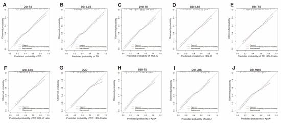 Calibration curve of the logistic regression models. For model validation, internal validation was adopted using a bootstrapping method with 1000 bootstrap resamples of 269 participants for Bias-corrected calibration curves. The apparent calibration curves were performed with the dataset of 269 participants. The predicted probabilities of TG ((A): DBI-TS, (B): DBI-LBS), HDL-C ((C): DBI-TS, (D): DBI-LBS), TC: HDL-C ((E): DBI-TS, (F): DBI-LBS, (G): DQD) and ApoA1 ((H): DBI-TS, (I): DBI-LBS, (J): DBI-HBS) by the logistic regression model conforms well to the observed probability. In the plot, all apparent calibration curves and Bias-corrected calibration curves are consistent with and the ideal lines (Predicated Probability = Observed Probability).