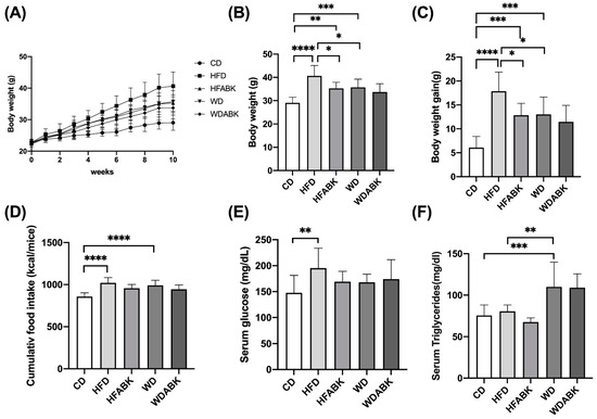Effect of AB-Kefir on obesity in HFD- and WD-fed mice. Effect of AB-Kefir on (A) body weight for 10 weeks, (B) body weight at week 10, (C) body weight gain, (D) cumulative food intake, and serum levels of fasting (E) glucose and (F) triglycerides. Data are expressed as mean ± S.D. (n = 10 per group) * p < 0.05, ** p < 0.01, *** p < 0.001, **** p < 0.0001. Statistics were analyzed by using one-way ANOVA with Tukey’s post hoc test.