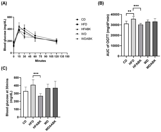 Effect of AB-Kefir on glucose tolerance test in HFD- and WD-fed mice. Overnight-fasted mice were administered 2.0 g/kg BW glucose by gavage. Blood samples were taken at 0, 15-, 30-, 60-, and 120-min post-administration to measure the levels of blood glucose. (A) Curve of OGTT, (B) AUC of OGTT, and (C) glucose level at 30 min of OGTT are shown. Data are expressed as mean ± SD (n = 8 per group). ** p < 0.01, *** p < 0.001. Statistics were analyzed by using one-way ANOVA with Tukey’s post hoc test.