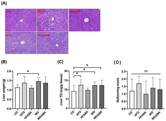 Effect of AB-Kefir on hepatic steatosis in HFD- and WD-fed mice. (A) H&E staining of representative histological sections of the liver tissue. Scale bar = 100 µm. (B) Liver weights and (C) hepatic triglyceride levels and (D) hepatocellular ballooning score are shown. Data are expressed as mean ± SD (n = 10 per group). * p < 0.05. ns: not significant. Statistics were analyzed by using one-way ANOVA with Tukey’s post hoc test.