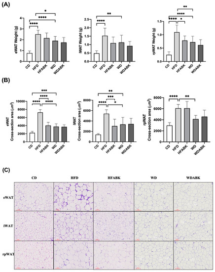 Because adipocyte hypertrophy is a characteristic of obesity, the tissue weight and volume of adipocytes in WAT of test mice were quantified. As shown in Figure 4A,B, compared to those in the CD group, tissue weight and cross-sectional area of adipocytes in eWAT, rpWAT, and iWAT were significantly increased by both HFD and WD. Moreover, the tissue weight and cross-sectional area of adipocytes in eWAT and rpWAT in HFD were higher than those in the WD group. In addition, a higher cross-sectional area of iWAT adipocytes was observed in the WD group. In contrast, AB-Kefir administration not only significantly reduced the tissue weight of iWAT but also decreased the cross-sectional area of adipocytes in eWAT and rpWAT in HFD-fed mice; however, AB-Kefir did not show a significant difference in these parameters in WD-fed mice.