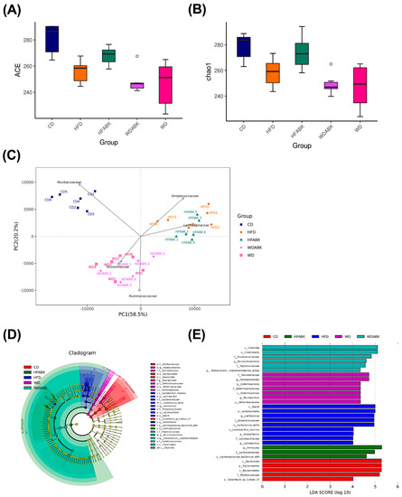 Effect of AB-Kefir on the gut microbiota composition in HFD- and WD-fed mice. (A) ACE, (B) Chao1 richness estimator, and (C) PCA plot of gut microbiota at the family level and the first two principal components, PC1 and PC2, are plotted. The five largest PCA loadings of taxa are indicated by arrows next to their genus names. (D,E) LEfSe comparison of the gut microbiota between CD, HFD, HFABK, WD, and WDABK groups. Each point represents one sample (n = 6 per group).