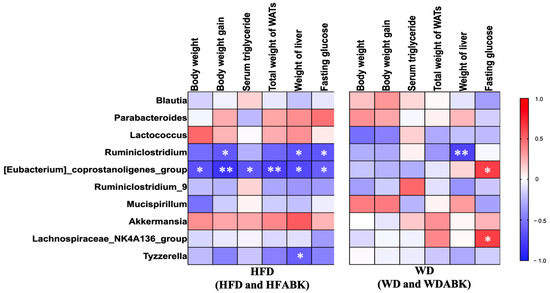 Spearman’s rank correlations between the top ten abundant bacterial genera and obesity-related parameters within HFD-fed mice (HFD and HFABK, n = 12) and WD-fed mice (WD and WDABK, n = 12). Spearman’s correlation analysis with an R value > 0.4 indicates a positive correlation (red color) and a value <−0.4 indicates negative correlation (blue color). * p < 0.05, ** p < 0.01.