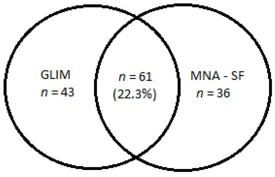 The number of subjects with malnutrition diagnosed based on the GLIM criteria and the MNA-SF score (malnutrition or risk of malnutrition). Notes: GLIM, Global Leadership Initiative on Malnutrition; MNA-SF, Mini Nutritional Assessment-Short Form.