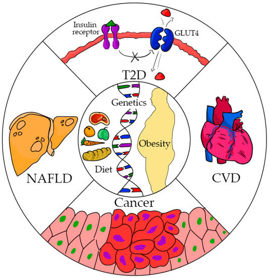 This figure depicts the main components associated with chronic disease in Latinos, gene variants, obesity, and diet (center of the figure) and the most common health disparities in the Hispanic population: non-alcoholic fatty liver disease (NAFLD), type 2 diabetes (T2D), cardiovascular diseases (CVD), and cancer.