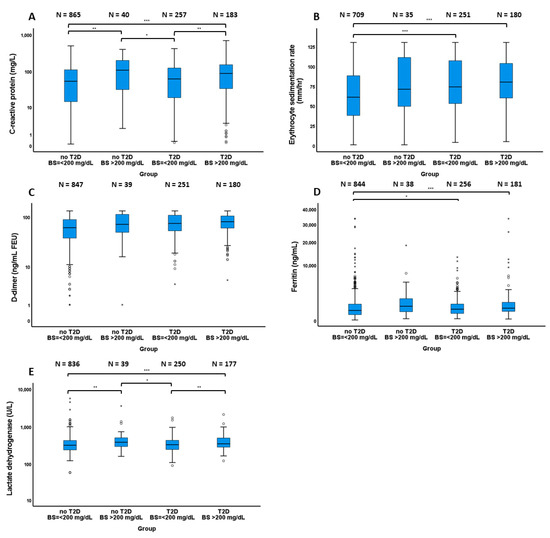Comparisons of inflammatory markers among patients with and without type 2 diabetes who had admission blood glucose ≤200 and >200 mg/dL. (A) C-reactive protein (B) Erythrocyte sedimentation rate (C) D-dimer (D) Ferritin (E) Lactate dehydrogenase. “*” denotes p < 0.05; “**” denotes p < 0.01; “***” denotes p < 0.001.