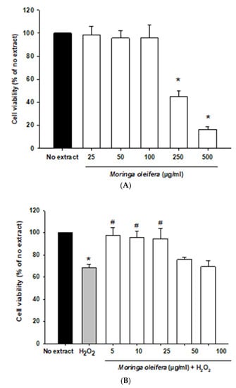 Effect of methanol extracts of Moringa oleifera leaf powder on antioxidant enzyme activity. Cells were pretreated with moringa (5, 10 and 25 µg/ml) for 24 h before 100 µM H2O2 for 1 h. * p < 0.05 versus extract, # p < 0.05 versus H2O2.