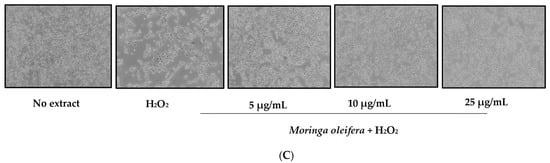 The most cytoprotective and non-toxic concentrations (5, 10 and 25 µg/mL) of Moringa oleifera methanol extracts were selected for subsequent experiments. Hydrogen peroxide can be converted into hydroxyl radical (HO•) via Fenton reaction []. The intracellular production of ROS was measured using the DCFHA-DA assay. As shown in Figure 2, hydrogen peroxide significantly increased by 56% compared to no extract cells. However, pretreatments with the three assayed concentrations of Moringa oleifera significantly reduced hydrogen peroxide-induced ROS overproduction. Similar results were observed for moringa leaf flavonoids in bovine mammary epithelial cells against hydrogen peroxide and the compound 1-O-(4-hydroxymethylphenyl)-α-L-rhamnopyranoside from Moringa oleifera seeds against carbon against CCl4 [,].