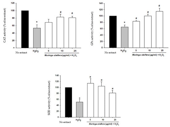 The antioxidant enzymatic defense system plays a key role against free radicals. The enzymes catalase (CAT), superoxide dismutase (SOD) and glutathione peroxidase (GPx) constitute the first defense system against oxidative stress. Superoxide dismutase (SOD) converts the superoxide anion radical into hydrogen peroxide. Catalase (CAT) and glutathione peroxidase (GPx) catalyze the decomposition of hydrogen peroxide to water (GPx) and to water and oxygen (CAT) []. In Figure 4, our study demonstrated that there is a significant decrease in the activity of these antioxidant enzymes by 53% for CAT, 51% for SOD and 65% for GPx compared to no extract cells (100%). However, pretreatments with moringa extracts reversed this impairment in the defensive system. For catalase, there was a significant increase at 10 and 25 µg/mL (82.9% and 81.2%). For SOD and GPx, the three assayed concentrations markedly improved the activity of these enzymes. The ability of moringa to increase antioxidant enzymatic activity suggests that their polyphenols have a direct antioxidant effect [].