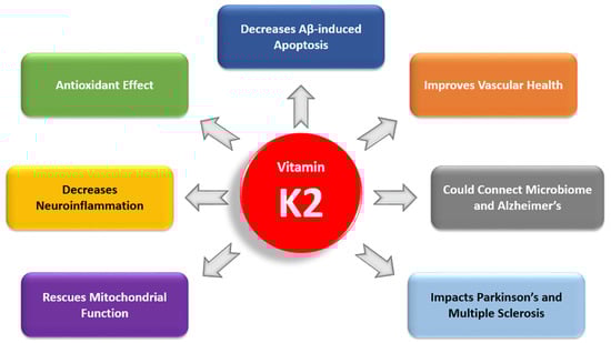 VK2 has recently emerged as an essential nutrient for human health, and a growing number of studies have demonstrated that VK2 and vitamin K-dependent proteins (VKDPs) may play an important role in slowing, and even preventing, the progression of AD. VK2 improves neuronal health through a variety of mechanisms: reducing apoptosis induced by β-amyloid (Aβ), limiting oxidative stress, reversing microglial activation, suppressing neuroinflammation, and improving vascular health.