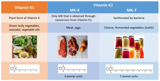 Commonly referred to as phylloquinone, VK1 is the plant form of vitamin K, and it is primarily found in green, leafy vegetables. Our interest in VK2 stems in part from the fact that the Western diet is low in this necessary nutrient. Women following a Western diet had a much lower VK2 intake (36 mcg compared to 154.1 mcg) than Japanese women who regularly consumed nattō, a traditional Japanese dish made from fermented soybeans [7,8]. On average, VK2 comprises just 10% of dietary vitamin K in European diets [9]. Almost all the MKs are synthesized by bacteria, and most can be found in fermented foods, such as nattō, sauerkraut, pickled vegetables, and some types of cheese. MK-4, the only VK2 isoform that is obtained through conversion from VK1 and not from bacterial synthesis, is present in meat, fish, and egg yolk [10,11].