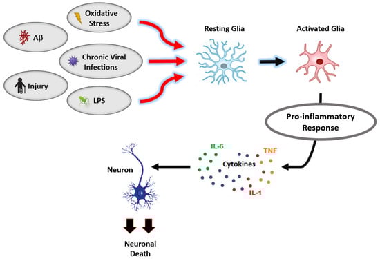 When microglia are activated, they initiate an inflammatory cascade, releasing an excess of proinflammatory mediators that include the cytokines tumor necrosis factor alpha (TNF-α), interleukin 1β (IL-1β), and interleukin 6 (IL-6) [57,58,59,68]. Several factors trigger microglial activation: oxidative stress, chronic infection, injury, Aβ, and lipopolysaccharide (LPS), a well-known endotoxin that is a major component of the cell wall in gram-negative bacteria [57,58,61,68,69] (Figure 4). The disruption of microglial homeostasis contributes to a persistent state of neuroinflammation and ultimately causes neurodegeneration through a variety of mechanisms: synaptic loss, neuronal death, and the activation of neurotoxic astrocytes [70,71,72].