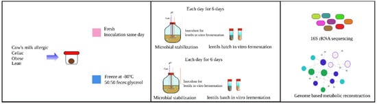This paper describes the effect of freezing fecal material as a means of preservation before in vitro fermentation experiments. Fecal material was collected from a healthy lean child, a child allergic to cow’s milk, an obese child, and a celiac child. Each stool was then divided in two fractions, one to be used fresh (on the day of collection) and the other to be frozen at −80 °C with glycerol following the guidelines for FMT []. The microbial community in the fecal samples was incubated over 6 days in a complex medium as in [], with the aim of giving the cells time to recover from the effects of freezing. As a control, the fresh samples were also incubated in the same manner. Each day, aliquots were taken to analyze the microbial community composition at each time point (Figure 1). Another aliquot was taken for use as microbial inoculum in the in vitro batch fermentation of lentils. Each day, (6 days total), lentils that were in the in vitro batch were fermented with the inoculum obtained that same day from the stabilization medium. Additionally, microbial community structures obtained at each time point in either the stabilization medium or the fermented lentils were used to contextualize a human gut microbiota metabolic network (GMMR) and obtain the microbial metabolic pathways present in each sample.