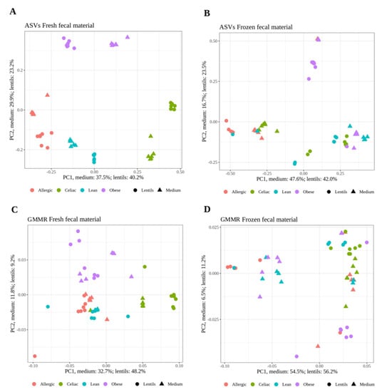 First, the distribution of the stabilization medium samples and the fermentation samples were explored via Principal Coordinates Analysis (PCoA) with Bray–Curtis distance using the ASVs obtained via 16S rRNA gene amplicon sequencing as input. As depicted in Figure 2A, when fresh fecal material was used, the samples were well separated according to the donor individual (i.e., celiac, obese, allergic, or lean) in both the STZ and LF samples. This shows that the microbiota of each individual changes little during the stabilization process in relation to inter-individual variation. However, when frozen fecal material was used, the separation was not so clear (Figure 2B). The output reactions obtained after contextualizing our GMMR were also studied via PCoA with Jaccard distance (Figure 2C,D). As with the ASVs, separation according to individuals was better when using fresh fecal material than when using frozen fecal material in both the STZ and LF samples. Regardless of the fecal material used, separation among the individuals was not as evident as it had been in the case of the ASVs, which would indicate that the microbiotas of different individuals are more similar functionally than structurally. This is likely due to the ability of several different bacteria to carry out the same metabolic function, which is known as functional redundancy [].