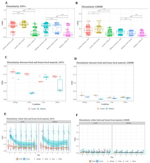 Bray–Curtis (ASVs) and Jaccard (GMMR) dissimilarity values. (A,B) show overall dissimilarity values in the three different situations tested for ASVs and GMMR for all days of the experiment considered together; (C,D) show dissimilarity values between fresh and frozen fecal material. Comparisons were made for each condition: day 1 fresh vs. day 1 frozen; day 2 fresh vs. day 2 frozen; day 3 fresh vs. day 3 frozen; day 4 fresh vs. day 4 frozen; day 5 fresh vs. day 5 frozen; day 6 fresh vs. day 6 frozen; (E,F) show dissimilarity values between stabilization and in vitro fermentation days. Here, each day is compared to the rest. Statistical labels: ** p < 0.01; **** p < 0.0001.