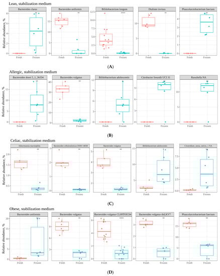 Top five discriminant ASVs between fresh and frozen samples in the stabilization medium, as determined via OPLS-DA. (A) show the results obtained with fecal samples of lean children. (B) show the results obtained with fecal samples of children with allergy to cow’s milk. (C) show the results obtained with fecal samples of celiac children. (D) show the results obtained with fecal samples of obese children. Statistical significance was obtained via Wilcoxon test (p < 0.05). Significance labels: ns: not significant; * p < 0.05; ** p < 0.01.