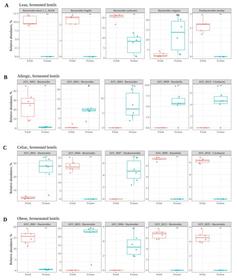 Top five discriminant ASVs between fresh and frozen samples after in vitro fermentation of lentils, as determined via OPLS-DA. (A) show the results obtained with fecal samples of lean children. (B) show the results obtained with fecal samples of children with allergy to cow’s milk. (C) show the results obtained with fecal samples of celiac children. (D) show the results obtained with fecal samples of obese children. Statistical significance was obtained via Wilcoxon test (p < 0.05). Significance labels: ns: not significant; ** p < 0.01.