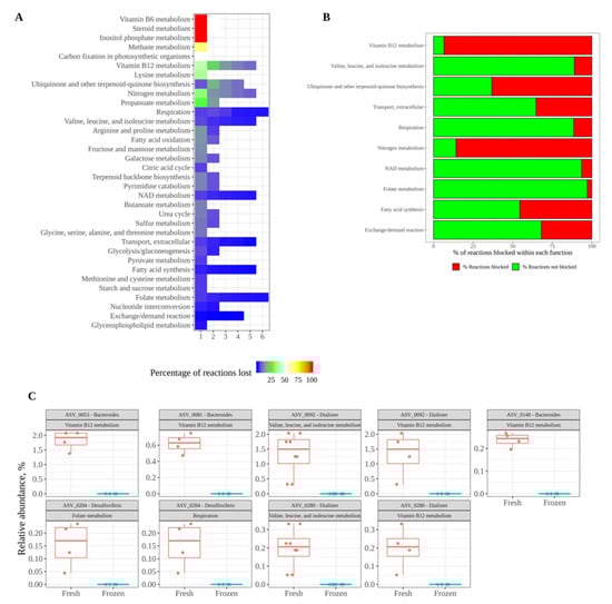 Finally, the microbial metabolic pathways that were not present after freezing the fecal material were studied. As depicted in Figure 6A, on the first stabilization day, many different reactions from different metabolic functions were not present in the frozen samples. However, as shown in the same figure (Figure 6A), the number of such reactions progressively decreased during stabilization days. Nevertheless, there were some functions with missing reactions until the last two stabilization days: vitamin B12 metabolism; nitrogen metabolism; valine, leucine, and isoleucine metabolism; fatty acid synthesis; NAD metabolism; extracellular transport; respiration; and folate metabolism. Further, folate metabolism and respiration did not recover the missing reactions. These data show how microbial communities need to be stabilized for several days in order to recover their functional potential, that and even with a 6-day stabilization period, not all reactions were recovered. Moreover, the loss of some reactions could also hamper further reactions that depend on the metabolites generated by the former, thus compromising entire metabolic pathways. Figure 6B shows the percentage of reactions that are blocked in each function as a consequence of the reactions lost on day 5. Given that the metabolic reconstruction performed is based on the species present in a given sample according to 16S rRNA gene analysis, the lack of certain reactions means that all of the microbes that encode them are also missing. Figure 6C depicts the microbes related to such functions and how they were present in fresh samples but not in frozen samples. These microbes, therefore, could be specially affected by freezing and could have an impact on the functionality of the microbial community.