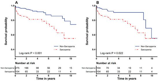 Kaplan–Meier survival curves of the sarcopenia and non-sarcopenia groups before (A) and after (B) propensity score matching analysis.