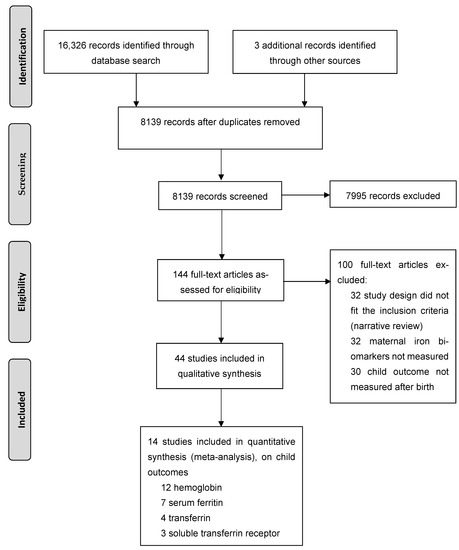 Observational and intervention studies were eligible for inclusion if they investigated the association between maternal iron status at any stage of pregnancy, in relation to child health outcomes. Inclusion criteria were as follows: (1) iron status measured during pregnancy by (ratios of) serum ferritin, transferrin, transferrin saturation, or total iron binding capacity, iron, sTfR, or genetic proxies for any of these parameters; and (2) any child outcome being assessed after birth (at any age and into adulthood) related to health, development, or wellbeing. In the selection procedure, the following exclusion criteria were applied: (1) intervention studies in which assessment of iron status was done only before (not during/after) iron supplementation, as iron supplementation does not always lead to higher iron status depending on physiological and environmental factors; (2) availability of solely maternal hematological markers (e.g., hemoglobin, hematocrit, and/or erythrocytes), while more specific markers for iron status in pregnancy are lacking; (3) only fetal or birth outcomes (such as birth weight, preterm birth) or measurements in umbilical cord blood, while outcomes after birth are missing; (4) report not written in English; (5) animal studies; (6) abstracts, reviews, or commentaries not reporting original data; (7) studies whereby no abstract or full text was available (after internet search, national and international library requests, and addressing corresponding authors by email).