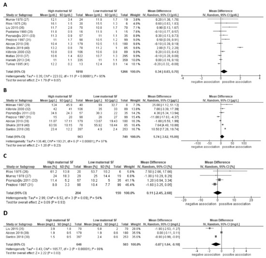 Forest plot of the associations of maternal serum ferritin levels during pregnancy with child hemoglobin concentrations (A), child serum ferritin concentrations (B), child transferrin saturation (C), and child soluble transferrin receptor concentrations (D). Random-effect meta-analysis showing the pooled mean difference child hemoglobin concentrations comparing high and low maternal serum ferritin in pregnancy. CI, confidence interval; IV, inverse variation; SF, serum ferritin; DF, degrees of freedom.