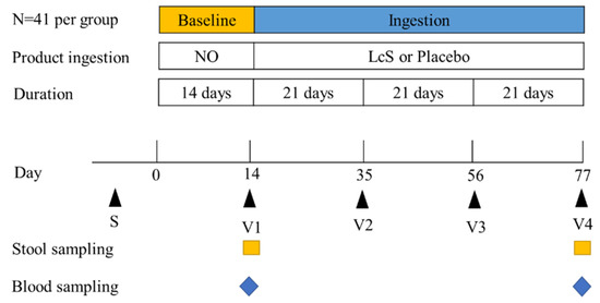 Study design. LcS: the fermented dairy beverage contained Lacticaseibacillus paracasei YIT 9029, V1–V4: visit 1–visit 4.