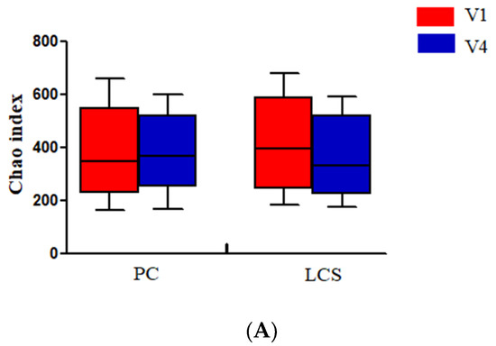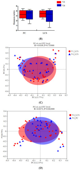 Diversity of the gut microbiota at the operational taxonomic unit (OTU) level. Alpha diversity was evaluated based on the Chao (A) and Shannon (B). Principal coordinates analysis (PCoA) of the beta diversity was based on the Bray-Curtis. (C) Differences between V1 and V4 in the LcS group. (D) Differences between V4 in the LcS and placebo groups. (E) Differences between V1 and V4 in the placebo group. V1_LCS; samples at V1 in the LcS group, V4_LCS: samples at V4 in the LcS group, V1_PC: samples at V1 in the placebo group, and V4_PC: samples at V4 in the placebo group.