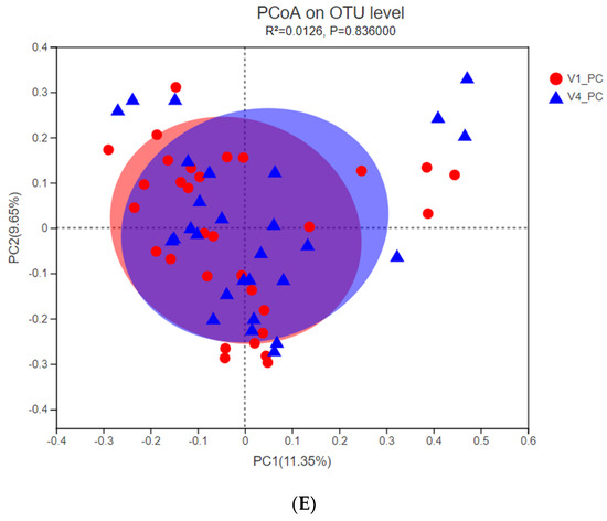 The β-diversity of the gut microbiota at the OTU level was identified using PCoA based on Bray–Curtis distances. The overall microbial composition was observed between both groups (Figure 3C–E). However, the difference between the V1 and V4 of the LcS group and V4 of the LcS group and placebo group were smaller, indicating that LcS did not alter the gut microbiota β-diversity.