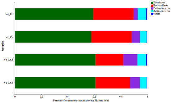Relative abundance of main phyla in different groups. V1_LCS: samples at V1 in the LcS group, V4_LCS: samples at V4 in the LcS group, V1_PC: samples at V1 in the placebo group, and V4_PC: samples at V4 in the placebo group.