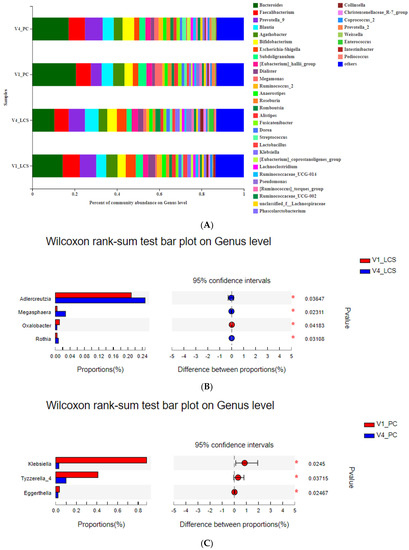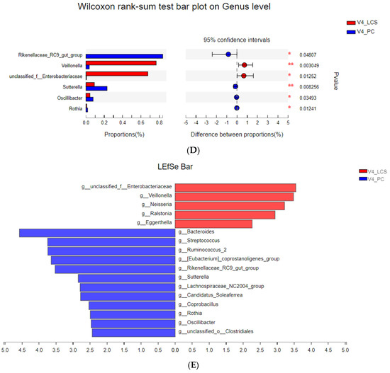 The effects of LcS on the gut microbiota on the genus level. (A) The relative abundance of the main genera was >1% in the different groups. (B) Significantly different genera levels between V1 and V4 of the LcS group analyzed by the Wilcoxon rank-sum test. (C) Significantly different genera levels between V1 and V4 of the placebo group analyzed by the Wilcoxon rank-sum test. (D) Significantly different genera levels between V4 of the LcS and placebo groups analyzed by the Wilcoxon rank-sum test. (E) Linear discriminant analysis (LDA) integrated with the effect size (LEfSe) analysis indicating genera that were significantly differentially abundant between V4 of the LcS and placebo groups (LDA score ≥ 2). * p < 0.05 and ** p < 0.01. V1_LCS: samples at V1 in the LcS group, V4_LCS: samples at V4 in the LcS group, V1_PC: samples at V1 in the placebo group, and V4_PC: samples at V4 in the placebo group.