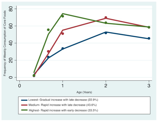 Three distinct core foods trajectories were identified (Figure 1): trajectory 1 (Lowest consumers—gradual increase with late decrease) comprising 22.9% of the sample; trajectory 2 (Medium consumers—rapid increase with late decrease) comprising 43.6%; and trajectory 3 (Highest consumers—rapid increase with early decrease) comprising 33.5%. The resulting patterns indicate that children’s core foods intake increased between 4 months and 2 years of age, with frequency for all patterns decreasing between 2 and 3 years of age. From the age of 1 to 2 years, children with the highest consumption began to decrease their intake of core foods, while children in the lower consumption trajectories continued to increase their consumption until 2 to 3 years, after which a downward decline in core foods consumption was observed. Overall, the medium and highest trajectories seemed to converge with advancing age, whilst the lowest trajectory remained distinct at the 3-year age point (Figure 1).