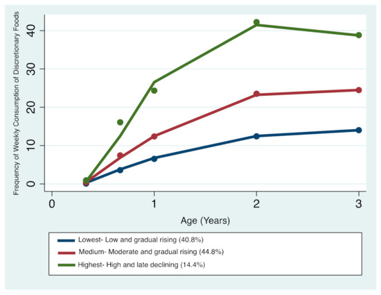 Three distinct discretionary foods trajectories were identified (Figure 2): trajectory 1—‘Lowest consumers—Low and gradual rising’ comprising 40.8% of the sample; trajectory 2—‘Medium consumers—Moderate and gradual rising’ comprising 44.8%; and trajectory 3—‘Highest consumers—High and late declining’ comprising 14.4%. The resulting patterns indicate that children’s discretionary foods intake steadily increased between 4 months and 3 years of age. Between 2 and 3 years of age, children who had the lowest and medium trajectories continued to have slightly higher or stable intakes respectively, whilst children who had the highest trajectories began a downward trend in discretionary foods consumption. Overall, all three trajectories remained distinctive with advancing age (Figure 2).